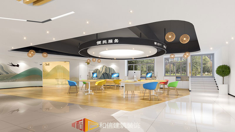 便民服務(wù)中心整個空間以暖色調(diào)為主,營造一種具有開放性、親民性、視覺性的特色空間格局,原木地板紅、藍、綠等亮色想碰撞,配以鏤空造型的燈具,營造出明亮的空間氛圍,同時也豐富了空間的層次感。