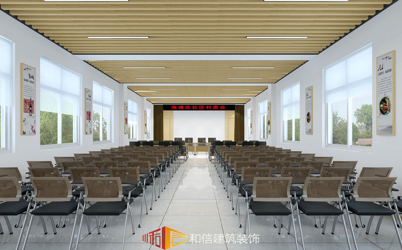 會議室椅子整齊地排列,給人一種穩(wěn)重大氣的感覺,兩邊墻面窗戶設(shè)計(jì),看似簡單,卻將室外的光線和景觀引入室內(nèi),在會議或者活動的同時還有美景相伴,減少了壓抑感。