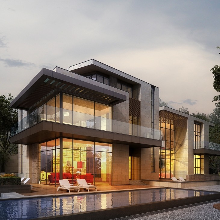 建筑遵循了住宅的通用設(shè)計(jì)語(yǔ)言,平整的建筑線條以及沉穩(wěn)色系。建筑、景觀、室內(nèi)的都有其各自獨(dú)特的出場(chǎng)方式,大面積的落地窗將起居空間與室外泳池及花園連接起來(lái),實(shí)現(xiàn)室內(nèi)室外在空間語(yǔ)言上的共存。